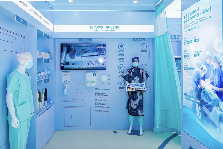 这一理念在现场展示中得到充分体现:术前准备区的全棉可降解刷手服、术中核心区的全棉水刺无纺布材料一次性手术包、术后区的棉材料病人服等产品,共同构成了绿色手术室的完整解决方案。